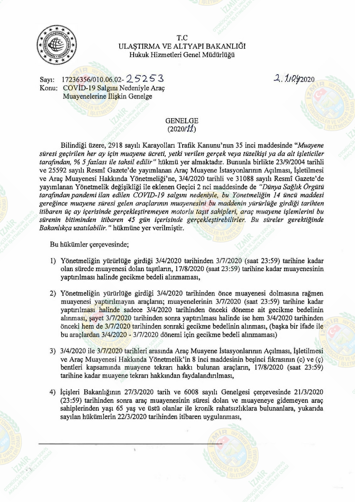 Ulaştırma ve Altyapı Bakanlığı’nın 2020/11 sayılı Genelgesi ile araç muayeneleri ile ilgili itirazlarımız dikkate alınmış ve 03.04.2020 – 03.07.2020 tarihleri arasında muayenesi olmayan araçlar için idari yaptırım (ceza) UYGULANMAMASINA karar verilmiştir.