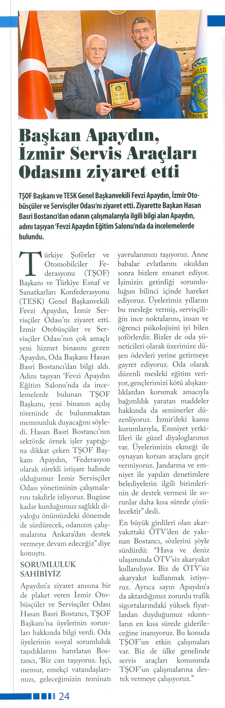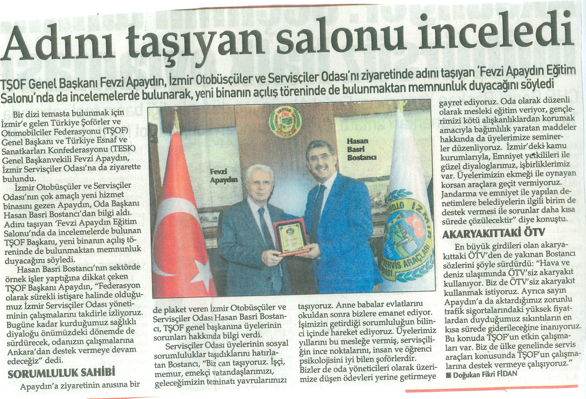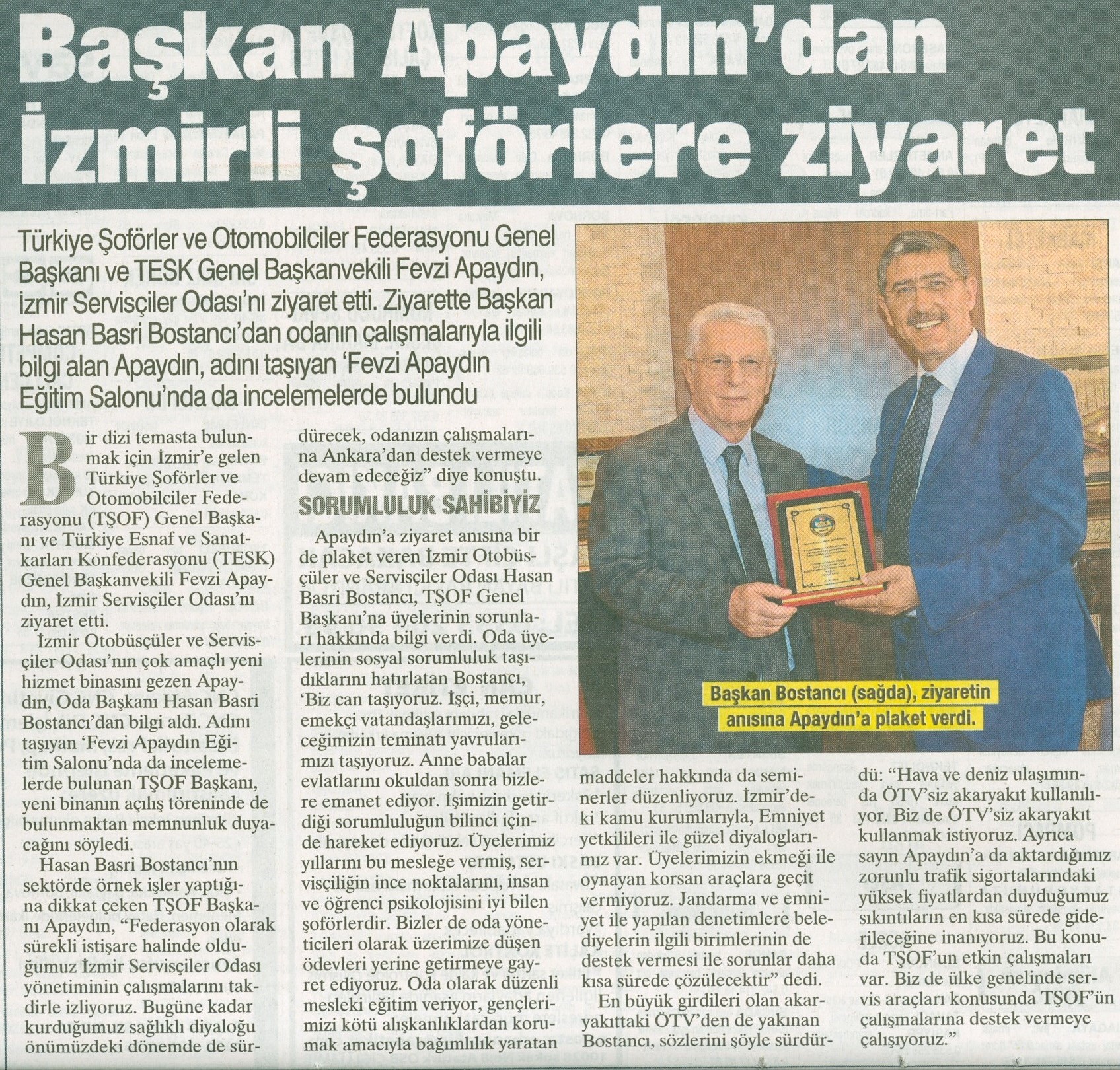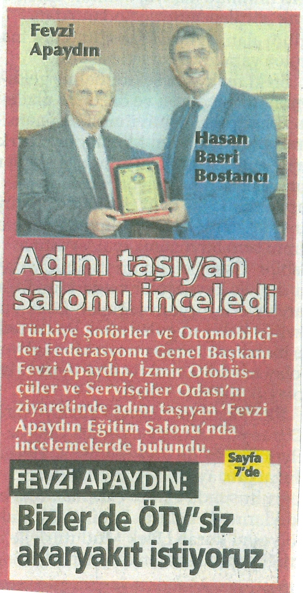Türkiye Şoförler ve Otomobilciler Federasyonu Genel Başkanı ve TESK Genel Başkanvekili Fevzi Apaydın, İzmir Servisçiler Odası’nı ziyaret etti. Ziyarette Başkan Hasan Basri Bostancı’dan odanın çalışmalarıyla ilgili bilgi alan Apaydın, adını taşıyan ‘Fevzi Apaydın Eğitim Salonu’nda da incelemelerde bulundu.