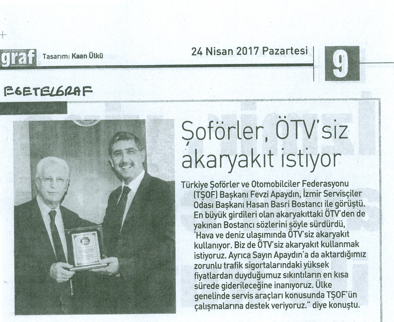 En büyük girdileri olan akaryakıttaki ÖTV’den de yakınan Bostancı, sözlerini şöyle sürdürdü: “Hava ve deniz ulaşımında ÖTV’siz akaryakıt kullanılıyor. Biz de ÖTV’siz akaryakıt kullanmak istiyoruz. Ayrıca sayın Apaydın’a da aktardığımız zorunlu trafik sigortalarındaki yüksek fiyatlardan duyduğumuz sıkıntıların en kısa sürede giderileceğine inanıyoruz. Bu konuda TŞOF’un etkin çalışmaları var. Biz de ülke genelinde servis araçları konusunda TŞOF’ün çalışmalarına destek vermeye çalışıyoruz.”