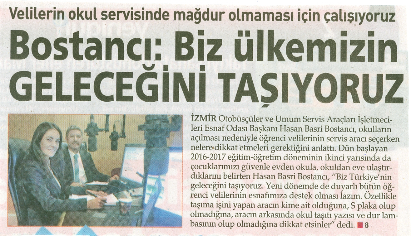Dün başlayan 2016-2017 eğitim-öğretim döneminin ikinci yarısında da çocuklarımızı güvenle evden okula, okuldan eve ulaştırdıklarını belirten Hasan Basri Bostancı, ”Biz Türkiye’nin geleceğini taşıyoruz. Her zaman kaliteyi bir tık yukarıya taşımak için elimizden geleni yapıyoruz. Esnafımızın ekmeğini bir dilim fazlalaştırmak hedefindeyiz.