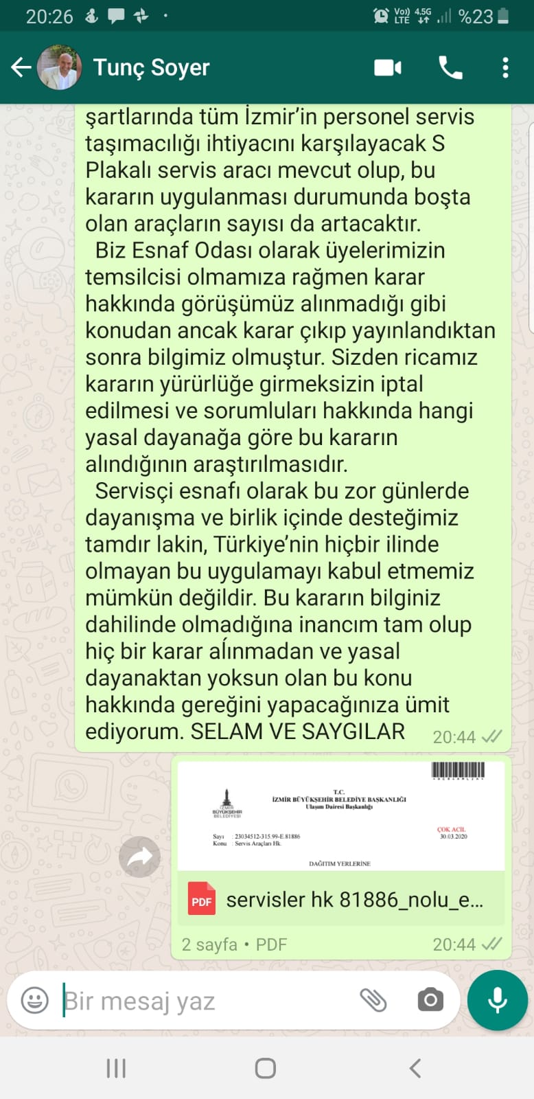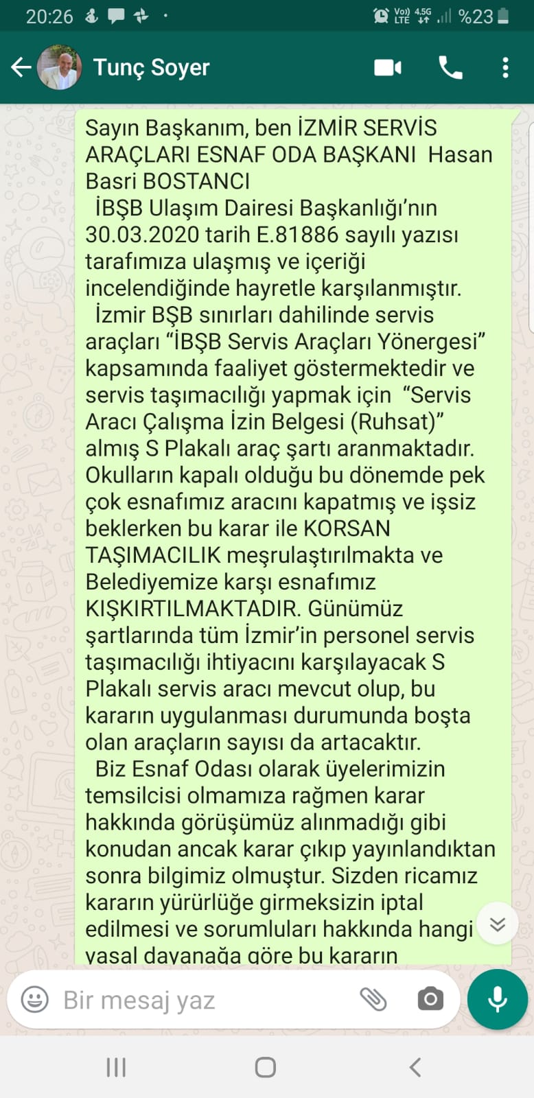 30.03.2020 Pazartesi mesai bitiminde ekte görmüş olduğunuz İBŞB Ulaşım Daire Başkanlığı yazısı elimize ulaşmış ve hemen başta Belediye Başkanımız Sn.Tunç SOYER ‘e yine ekte gördüğünüz mesaj yazılarak kendisine cep telefonundan ulaştırılmıştır. Bugün de Millet Vekilleri dahil olmak üzere tüm yollardan kararın iptali için girişimlerde bulunulmuş, hepsinden müdahale ve düzeltme sözü alınmış fakat bu saate kadar bir sonuç elde edilememiştir. Mücadelemizin devam edeceğini bildirmekle beraber kararı sizinle paylaşma gereği doğmuştur. Bu zor günlerimizi kendi çıkarları için bahane edenlerin karşısında ve esnafımızı korumak için her zaman yanlarında durmaya devam edeceğiz. Kararın iptali için girişimlerimiz tüm mercilere devam etmektedir.