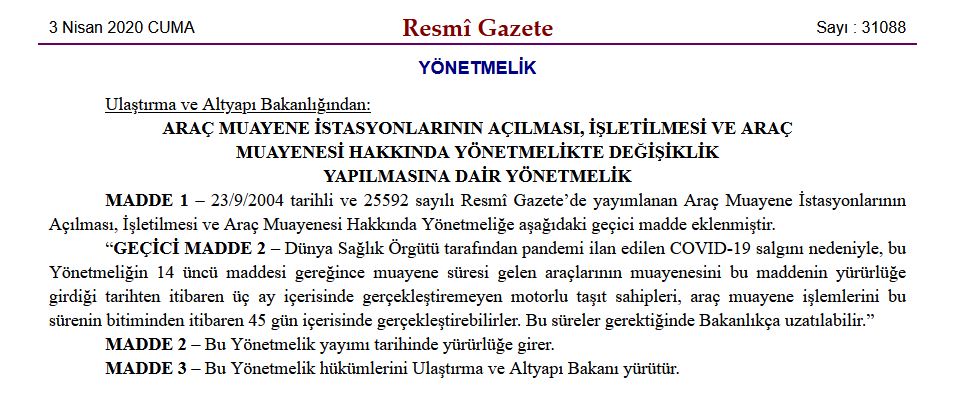 Bugün yayınlanan (03.04.2020) Resmi Gazete ile Araç Muayenesini bugünden itibaren 3 ay içerisinde gerçekleştiremeyen araç sahipleri, bu sürenin bitiminden itibaren 45 gün içinde muayenelerini yaptırabileceklerdir.