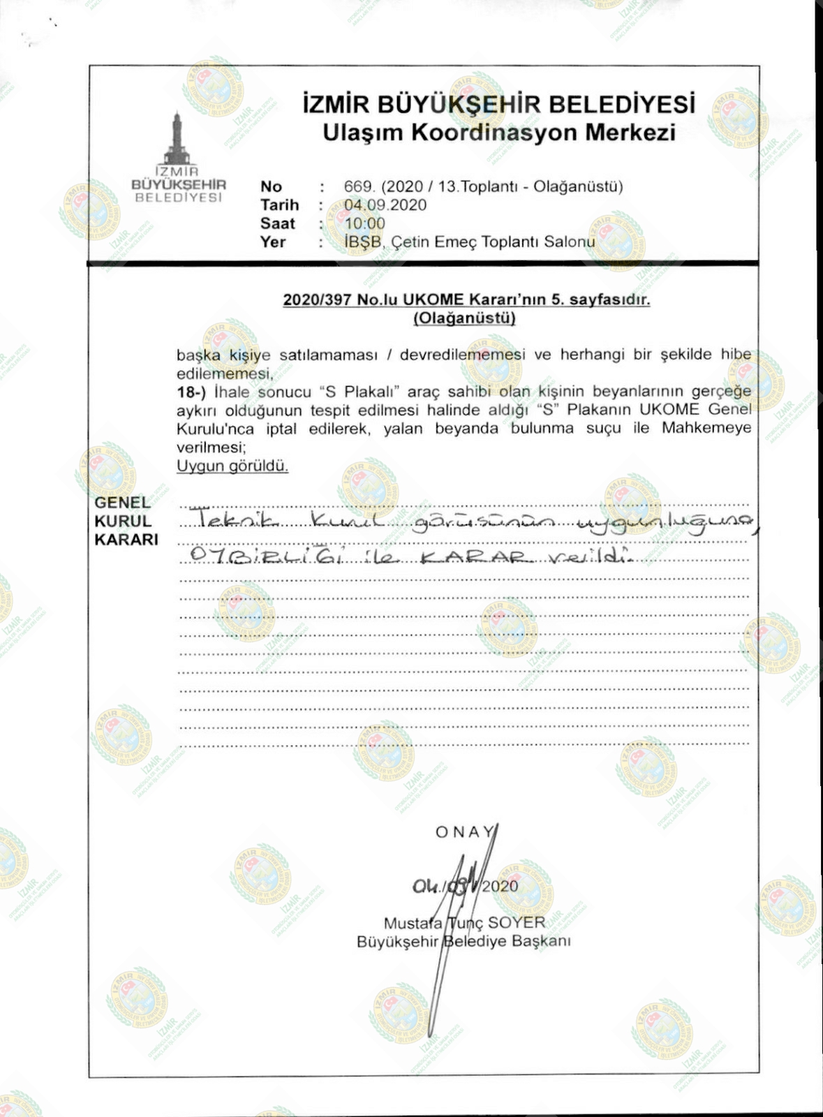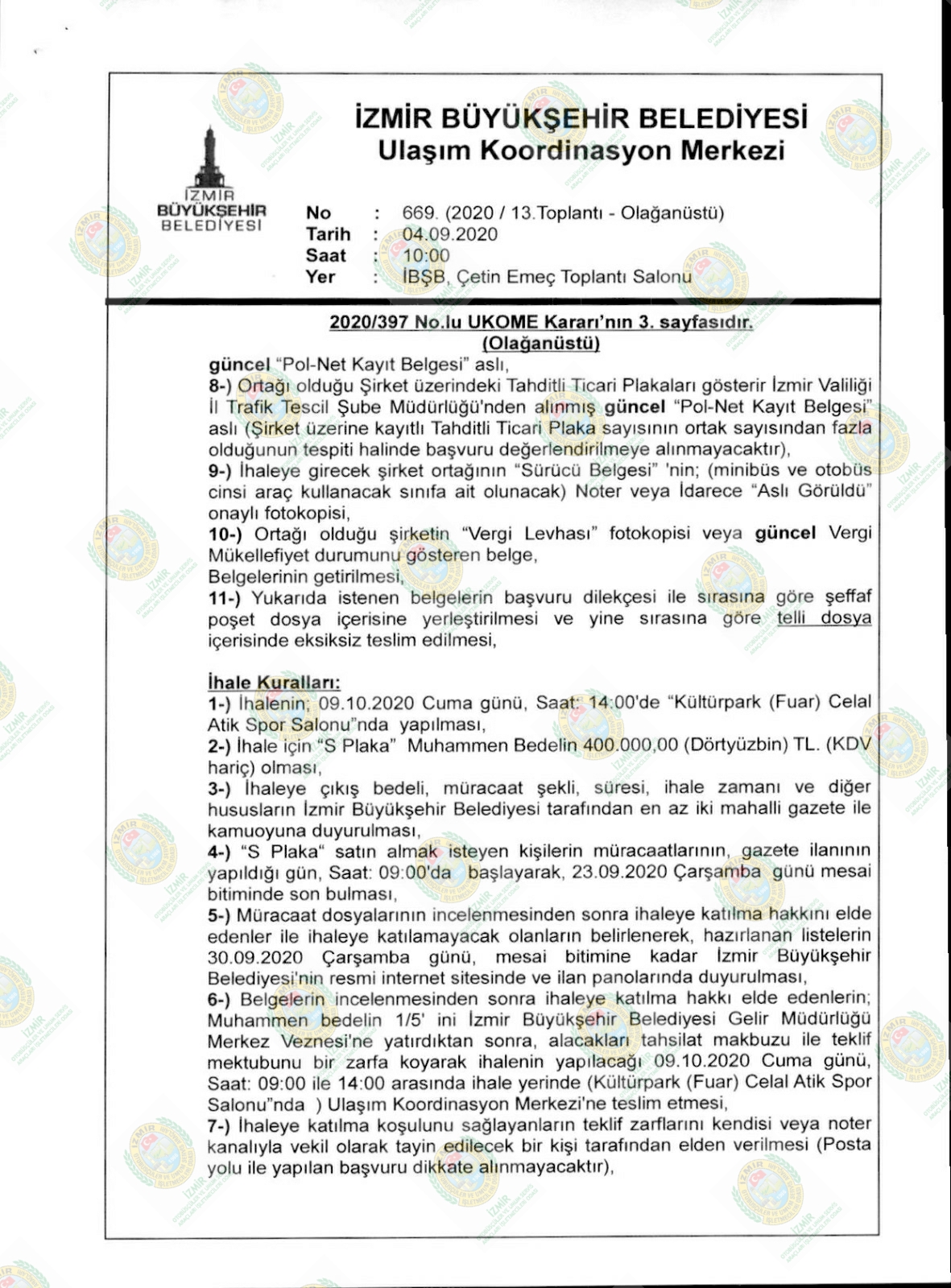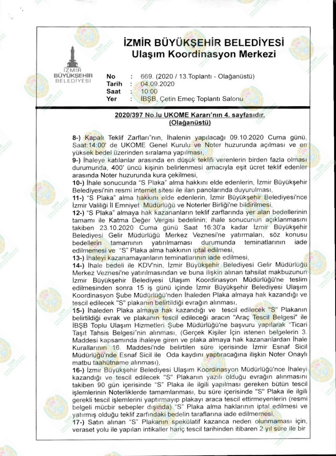 İzmir Büyükşehir Belediyesi sınırları içerisinde “S” Plakalı araç sayısının 400 adet arttırılması yönünde hazırlanan UKOME kararı (İHALE ŞARTNAMESİ) yayınlanmıştır.