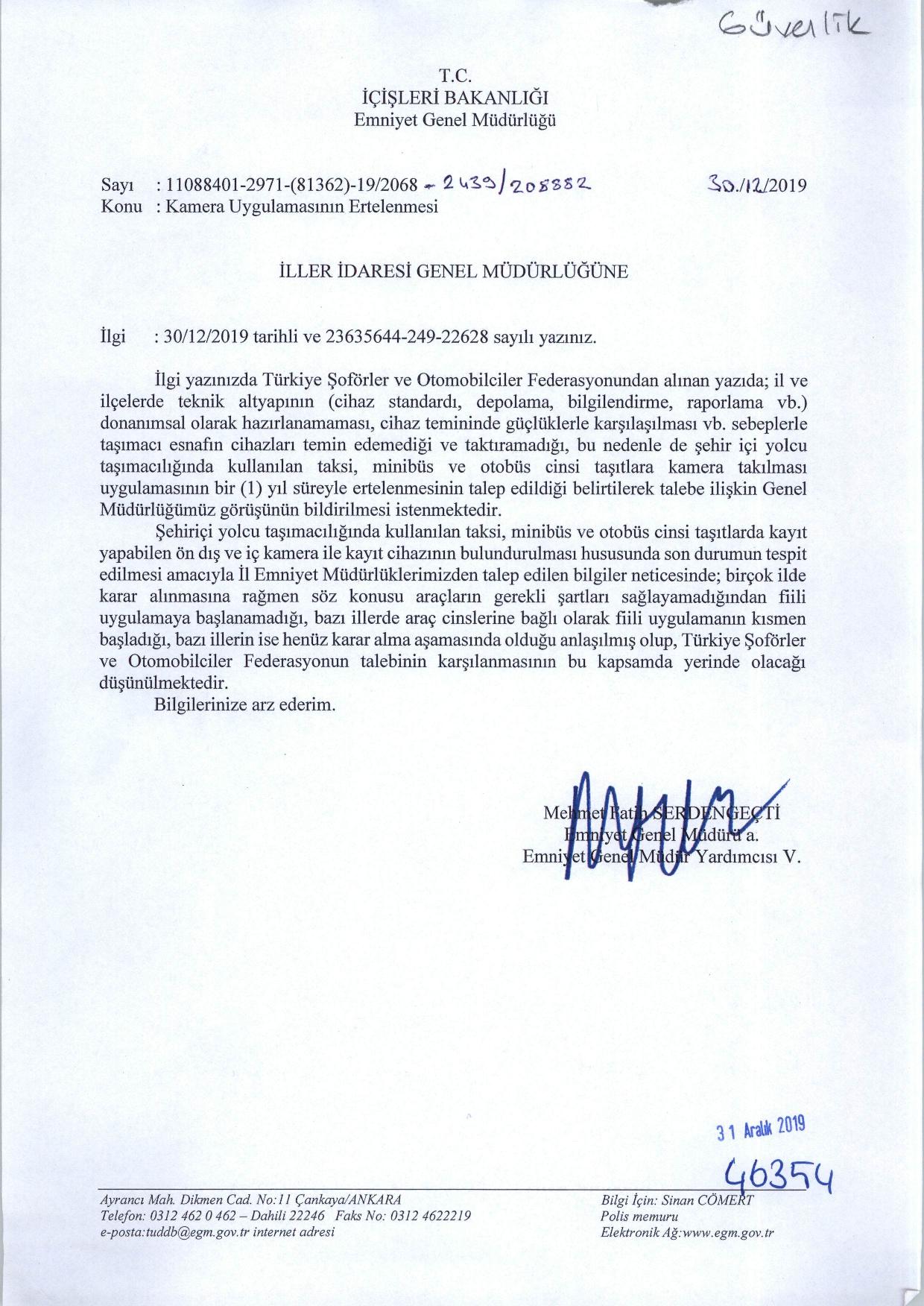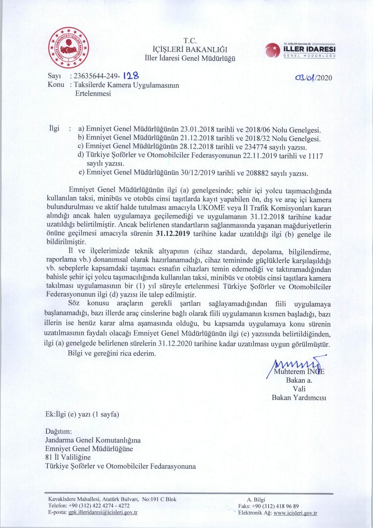Odamızın girişimleri, Federasyonumuzun talebiyle şehiriçi yolcu taşımacılığında kullanılan taksi, minibüs ve otobüs cinsi taştlarda kayıt yapabilen ön ve iç kamera ile kayıt cihazlarının bulundurma ve aktif tutulması zorunluluğu 31.12.2020 tarihine kadar uzatılması uygun görülmüş ve İçişleri Bakanlığı, İller İdaresi Genel Müdürlüğü’nün 03.01.2020 tarihli yazısı ile yürürlüğe girmiştir.