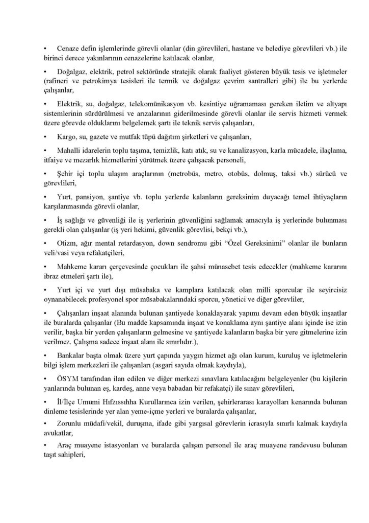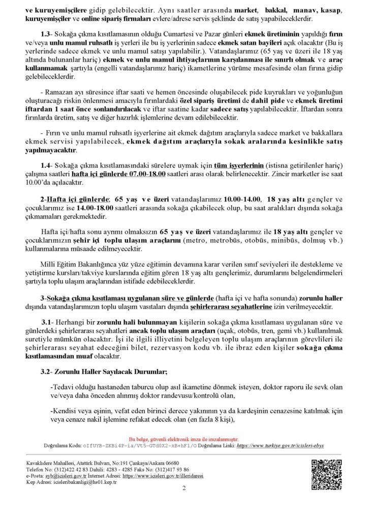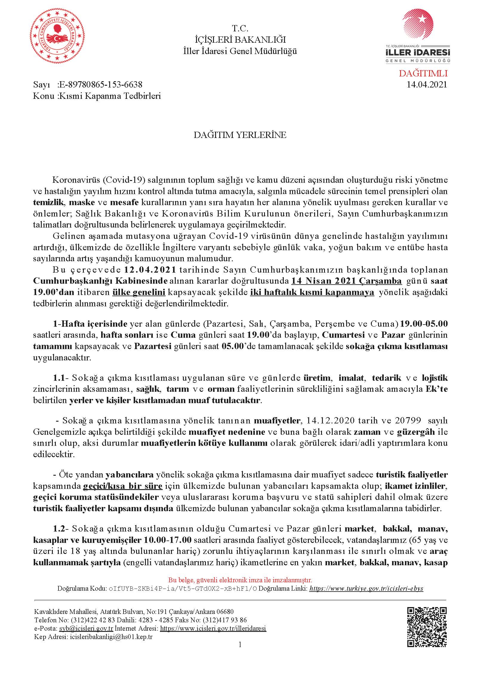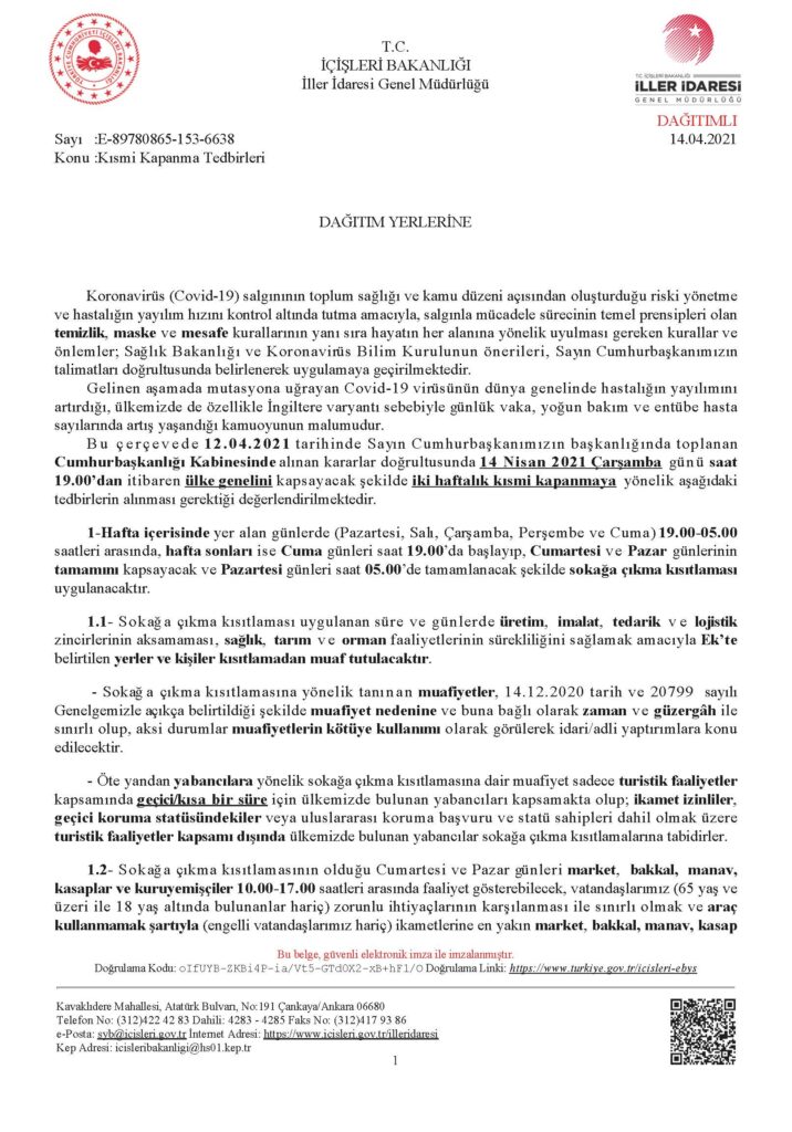 İçişleri Bakanlığı 81 İl Valiliğine “Kısmi Kapanma” konulu genelge gönderdi. Sokağa çıkma kısıtlama sürelerine uyum için istisnalar haricinde işyerleri hafta içi 07.00-18.00 saatleri arası açık olabilecek. Hafta içi 65 yaş ve üstü kişiler 10-14 saatleri arası, 18 yaş altındakiler ise 14-18 saatleri arasında sokağa çıkabilecek.