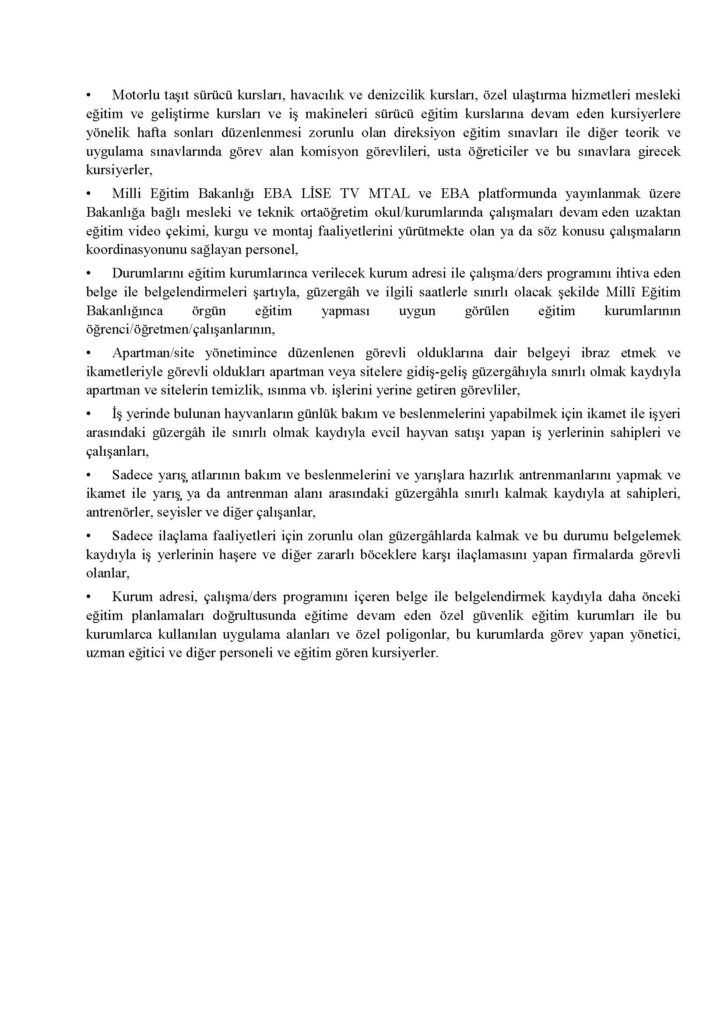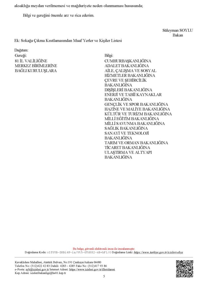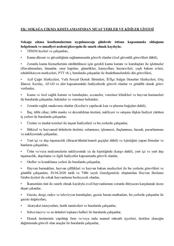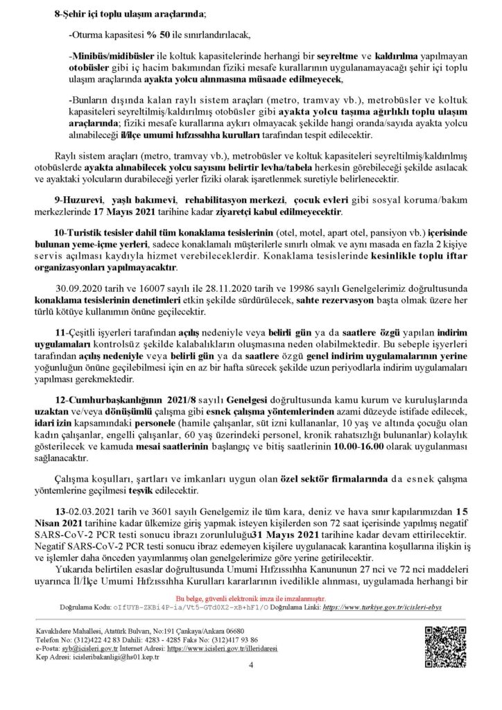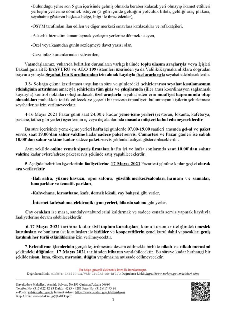 İçişleri Bakanlığı 81 İl Valiliğine “Kısmi Kapanma” konulu genelge gönderdi. Sokağa çıkma kısıtlama sürelerine uyum için istisnalar haricinde işyerleri hafta içi 07.00-18.00 saatleri arası açık olabilecek. Hafta içi 65 yaş ve üstü kişiler 10-14 saatleri arası, 18 yaş altındakiler ise 14-18 saatleri arasında sokağa çıkabilecek.