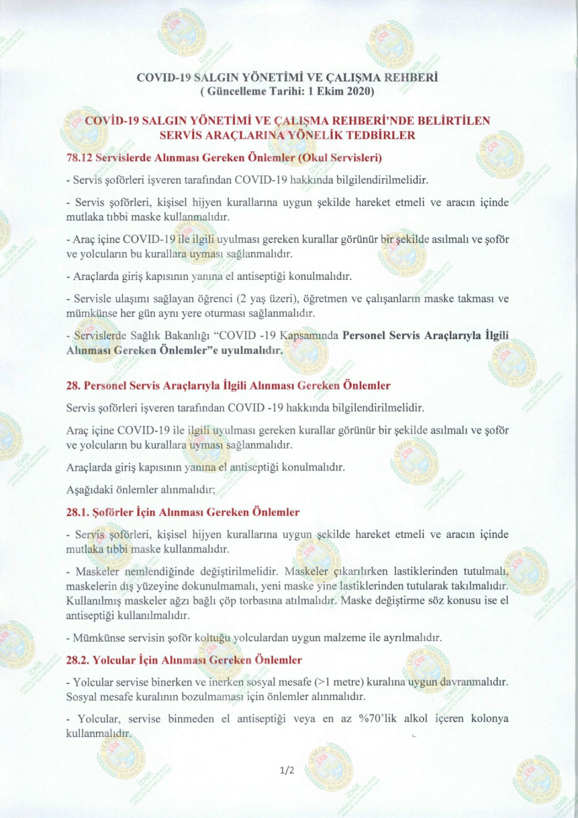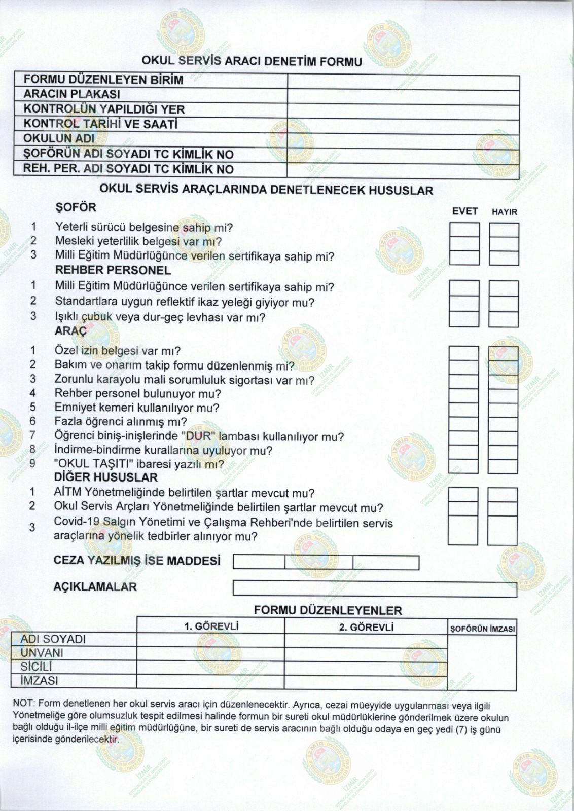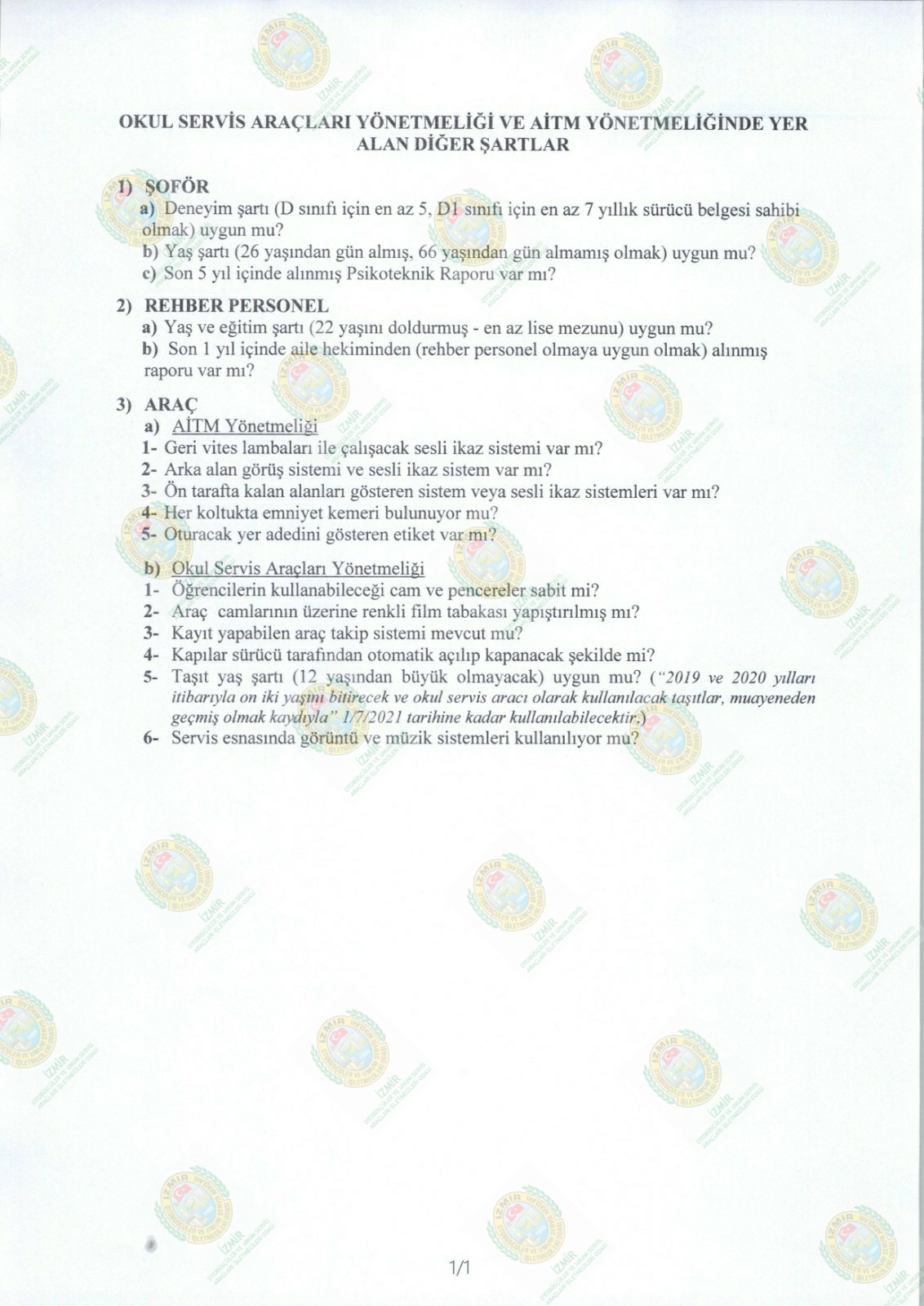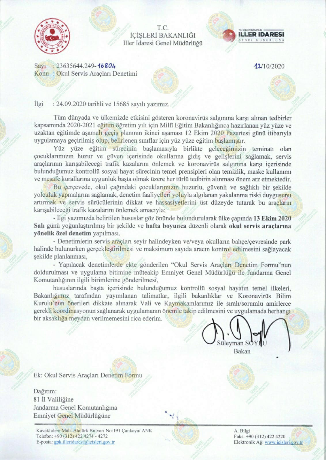 İçişleri Bakanlığı, İller İdaresi Genel Müdürlüğü’nün 16804 No’lu genelgesi gereğince 13.10.2020 tarihinde yoğun olmak üzere hafta içerisinde Okul Servis Araçlarında denetim yapılacaktır. Üyelerimizin servis esnasında ekteki hususlara hassasiyetle dikkat etmeleri gerekmektedir. Kazasız belasız hayırlı günler dileriz.