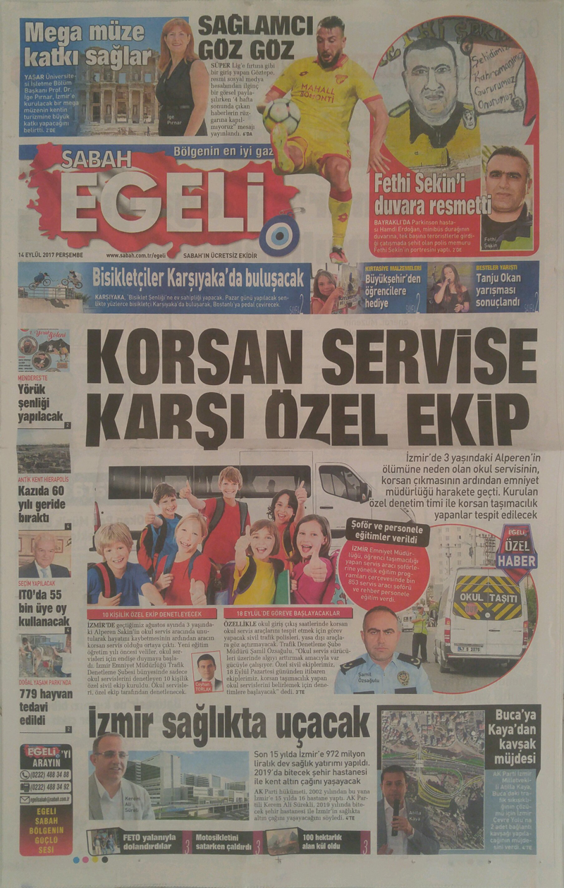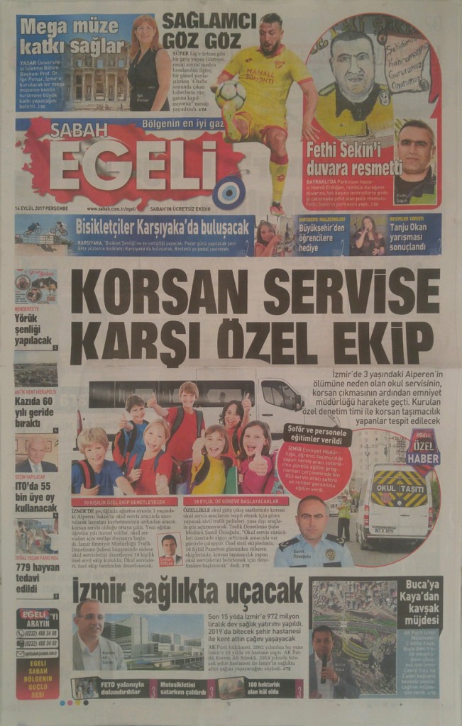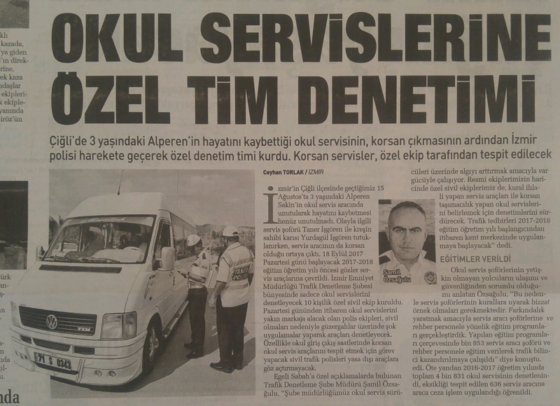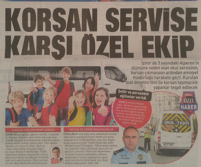 İzmir’in Çiğli ilçesinde geçtiğimiz 15 Ağustos’ta 3 yaşındaki Alperen Sakin’in okul servis aracında unutularak hayatını kaybetmesi henüz unutulmadı. Olayla ilgili servis şoförü Taner İşgören ile kreşin sahibi karısı Yurdagül İşgören tutuklanırken, servis aracının da korsan olduğu ortaya çıktı. 18 Eylül 2017 Pazartesi günü başlayacak 2017-2018 eğitim öğretim yılı öncesi gözler servis araçlarına çevrildi. İzmir Emniyet Müdürlüğü Trafik Denetleme Şubesi bünyesinde sadece okul servislerini denetleyecek 10 kişilik özel sivil ekip kuruldu. Pazartesi gününden itibaren okul servislerini yakın markaja alacak olan polis ekipleri, sivil olmaları nedeniyle güzergahlar üzerinde şok uygulamalar yaparak araçları denetleyecek. Özellikle okul giriş çıkış saatlerinde korsan okul servis araçlarını tespit etmek için görev yapacak sivil trafik polisleri yasa dışı araçlara göz açtırmayacak. Egeli Sabah’a özel açıklamalarda bulunan Trafik Denetleme Şube Müdürü Şamil Özsağulu, “Şube müdürlüğümüz okul servis sürücüleri üzerinde algıyı arttırmak amacıyla var gücüyle çalışıyor. Resmi ekiplerimizin haricinde özel sivil ekiplerimiz de, kural ihlali yapan servis araçları ile korsan taşımacılık yapan okul servislerini belirlemek için denetimlerini sürdürecek. Trafik tedbirleri 2017-2018 eğitim öğretim yılı başlangıcından itibaren kent merkezinde uygulanmaya başlayacak” dedi.