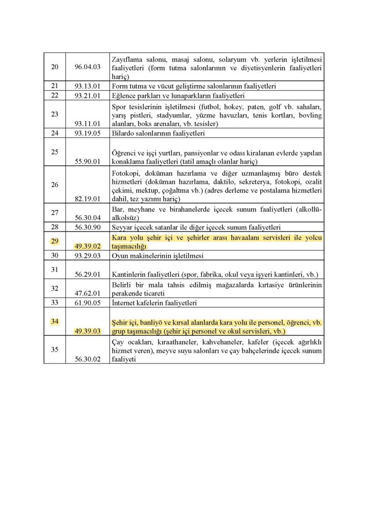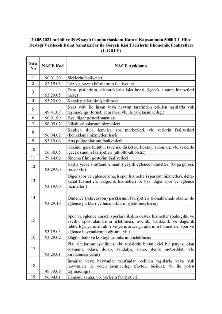 Hibe desteğinden faydalanacak olan esnaflarımızın nace kodları Ticaret Bakanlığı tarafından paylaşılmıştır.