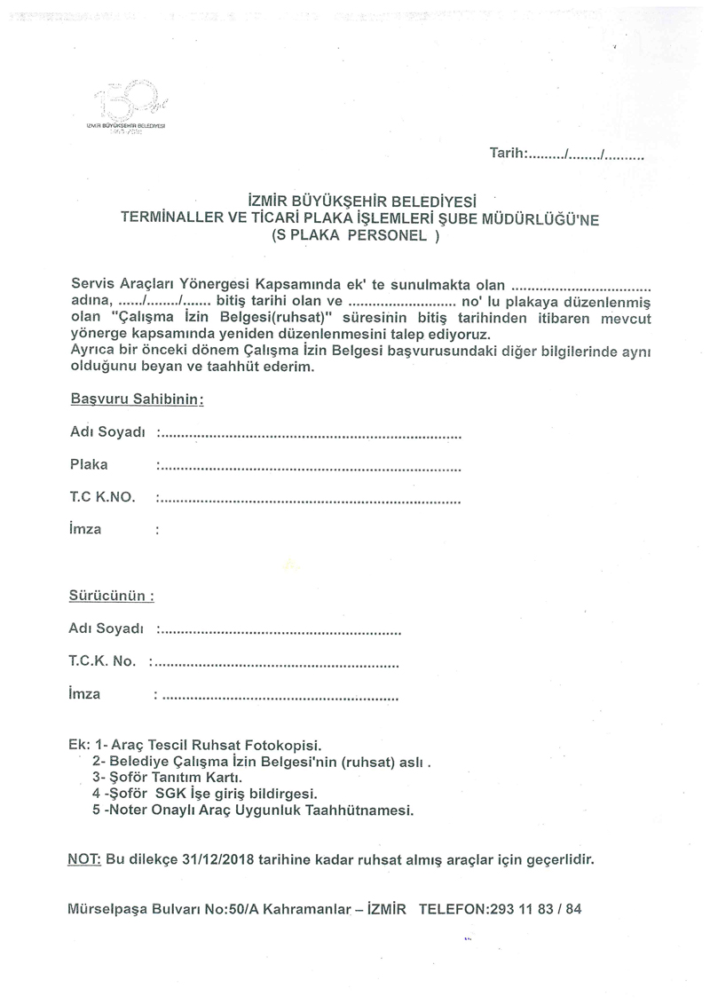 İzmir Büyükşehir Belediyesi Terminaller Şube Müdürlüğü “Çalışma İzin Belgesi (Ruhsat)” uzatma ve yenileme başvurularını kabul etmeye başlamıştır.