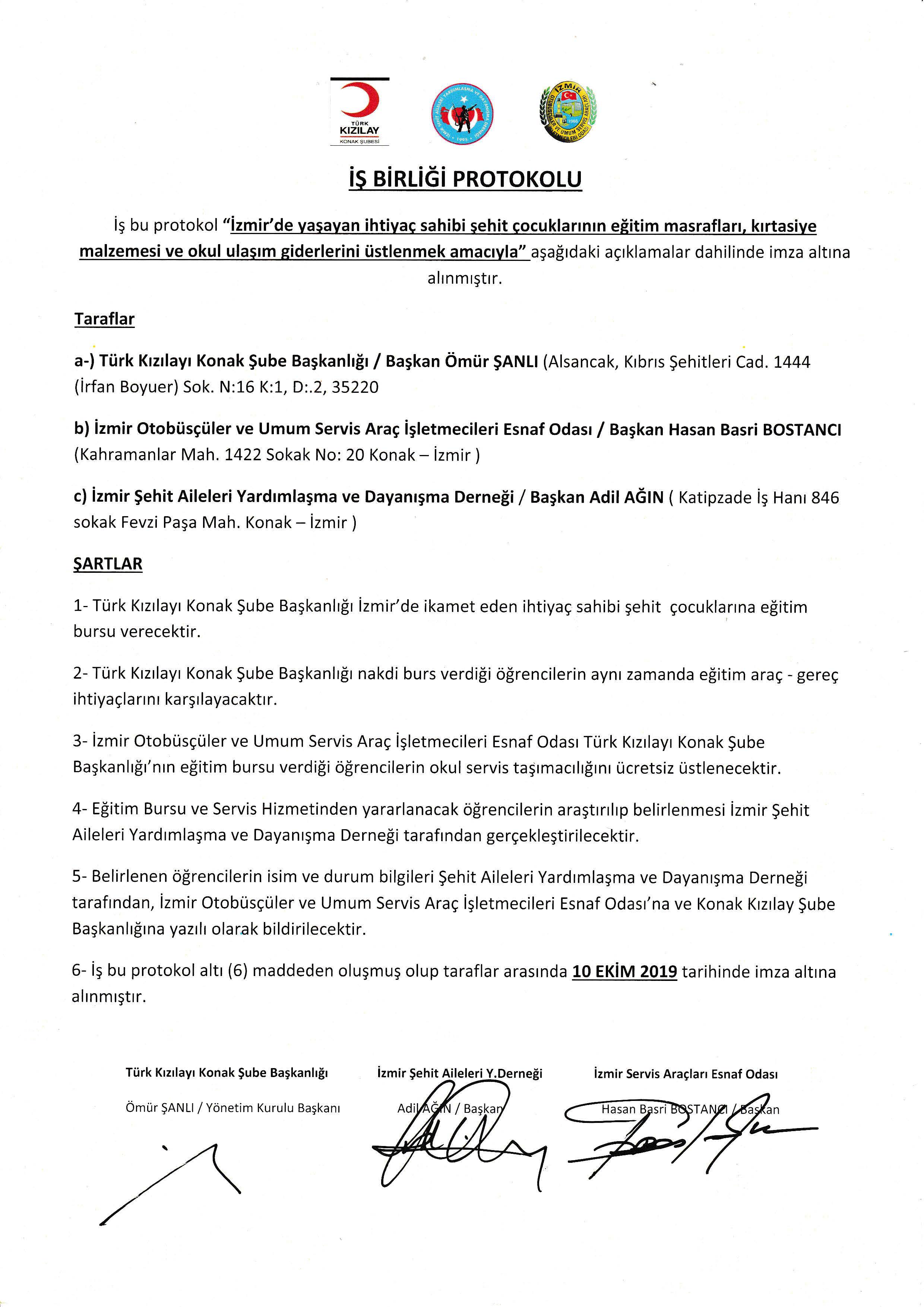 Protokolde yer alan şartlarda; Türk Kızılayı Konak Şube Başkanlığı’nın İzmir’de ikamet eden ihtiyaç sahibi şehir çocuklarına eğitim bursu ve aynı zamanda eğitim araç-gereç ihtiyaçlarının karşılanması; İzmir Otobüsçüler ve Umum Servis Araç İşletmecileri Esnaf Odası’nın o öğrencilerin okul servis taşımacılığını ücretsiz yapması ve bu hizmetlerden yararlanacak olan öğrencilerin de İzmir Şehit Aileleri Yardımlaşma Derneği tarafından belirlenmesi ile ilgili maddeler yer aldı.