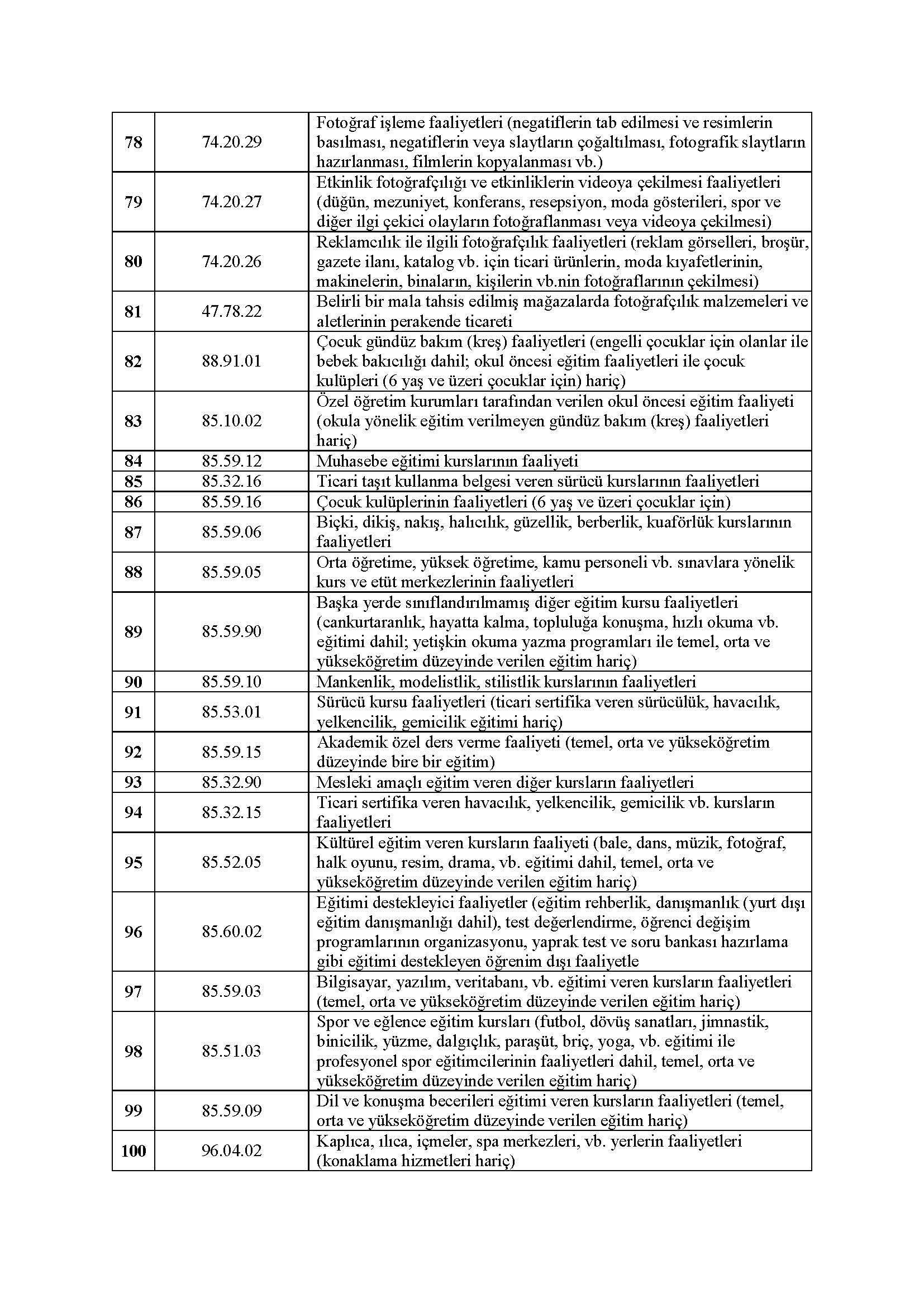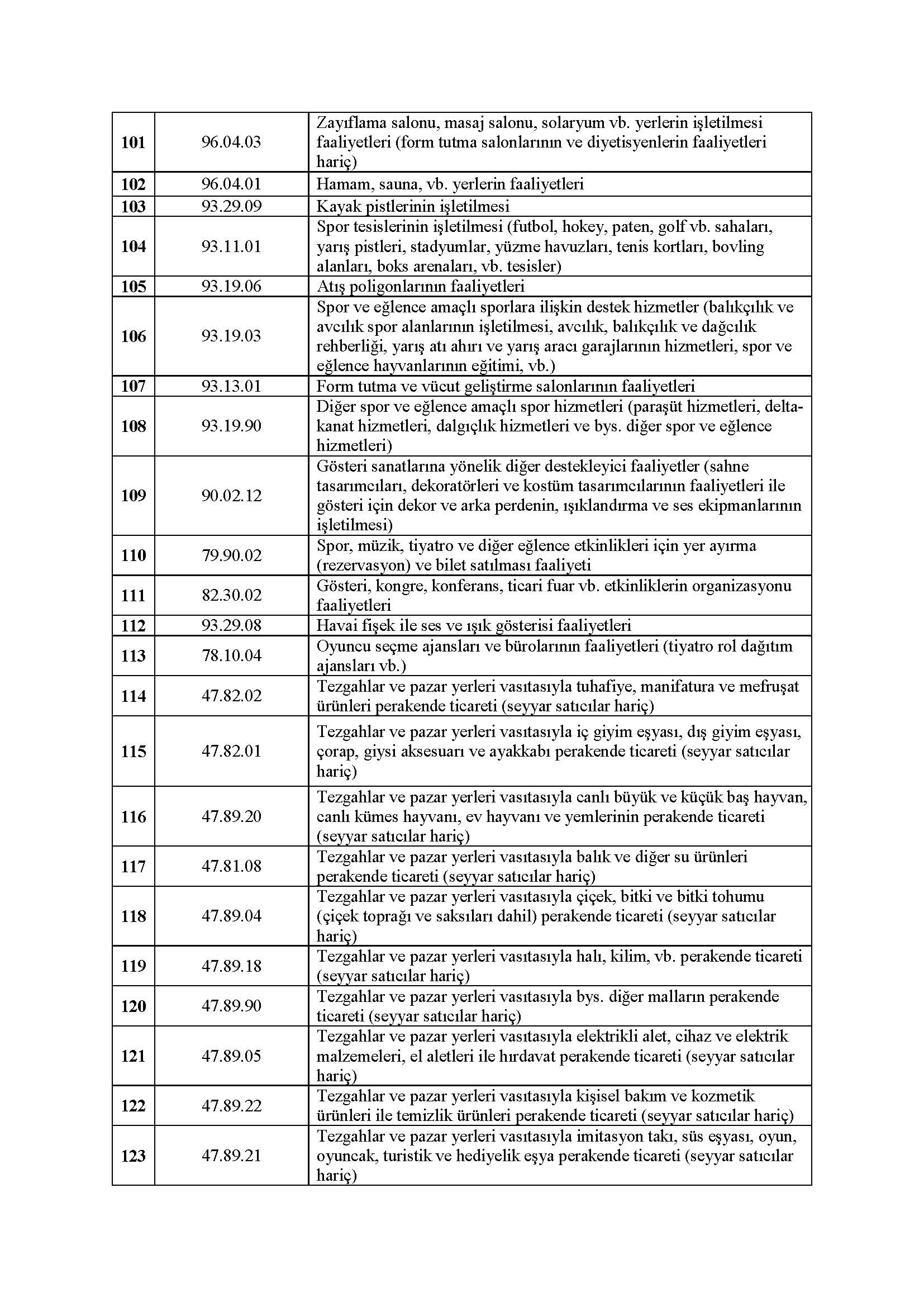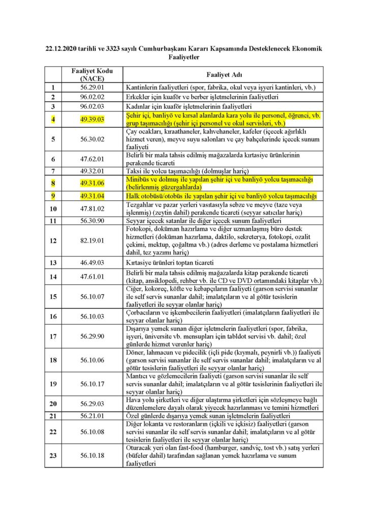 22.12.2020 tarihli ve 3323 sayılı Cumhurbaşkanı Kararı Kapsamında Desteklenecek Ekonomik Faaliyetler aşağıda listelenmiştir.
